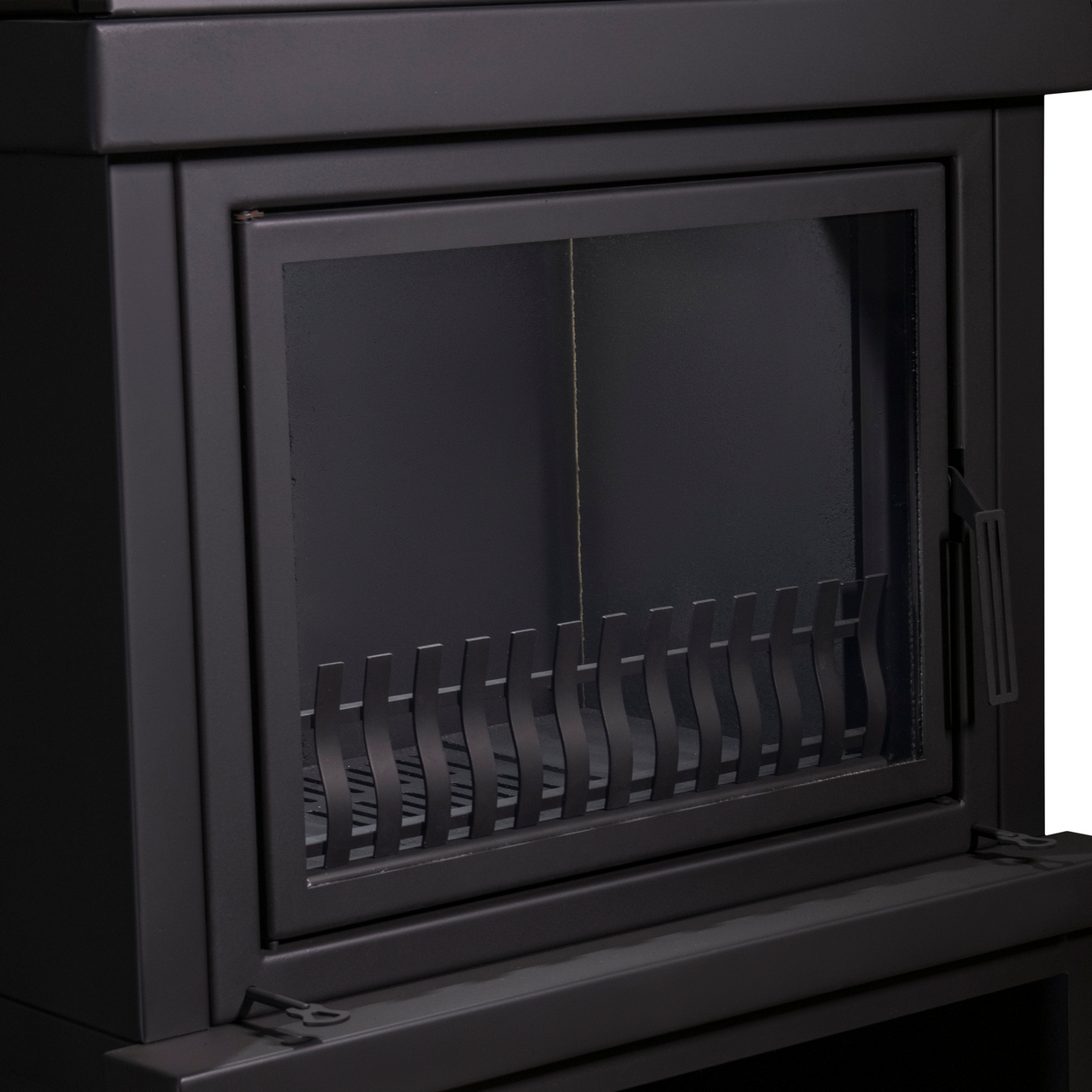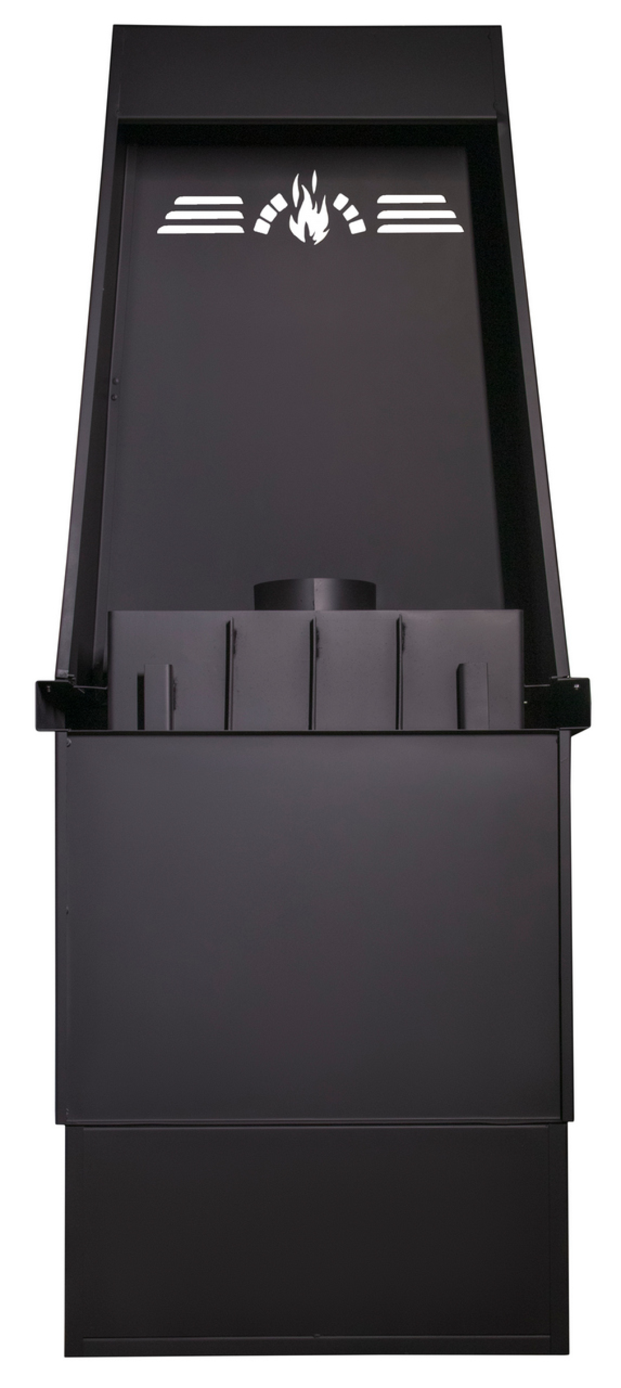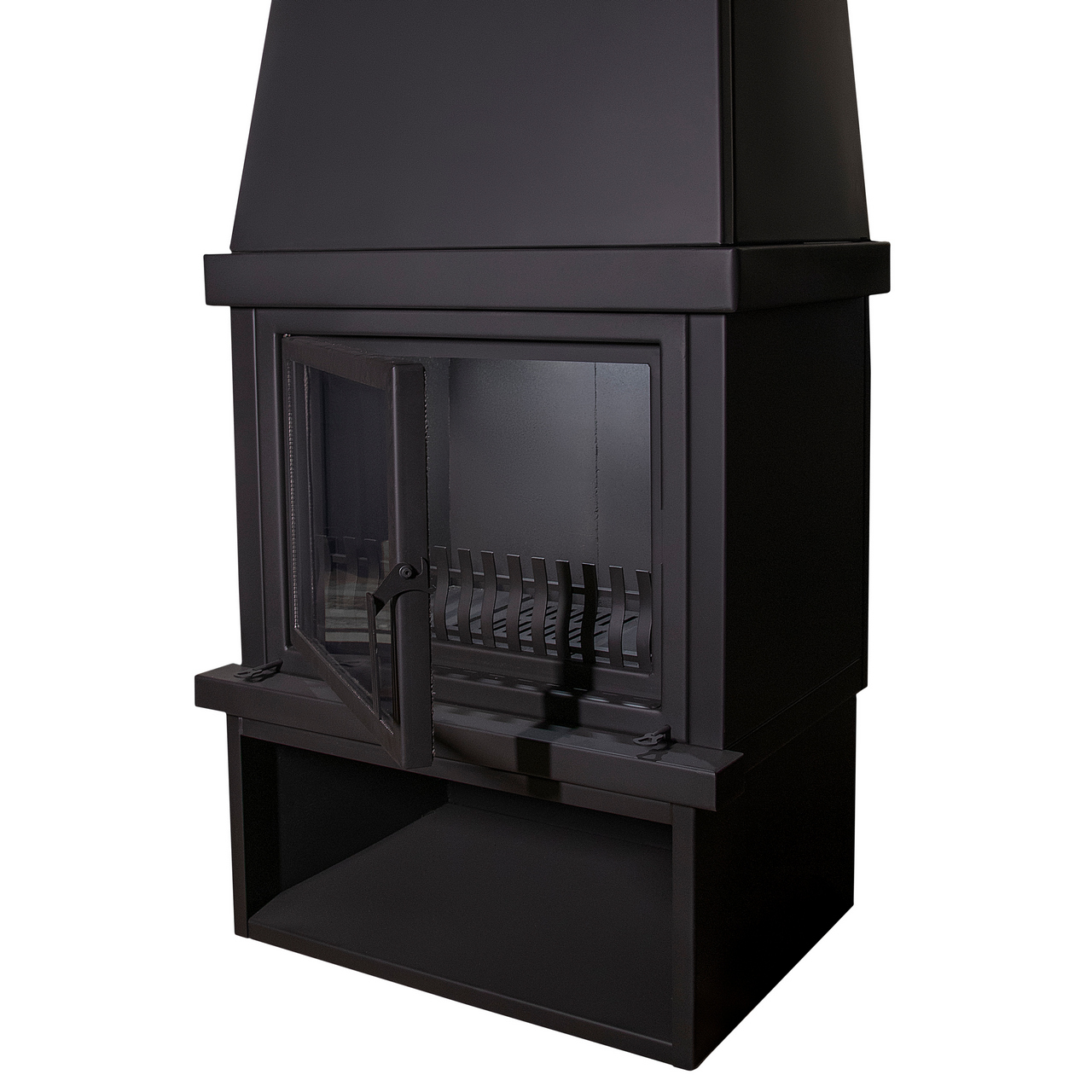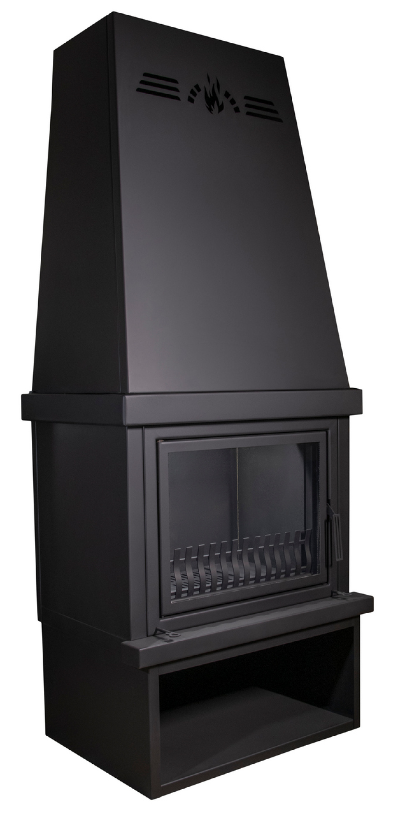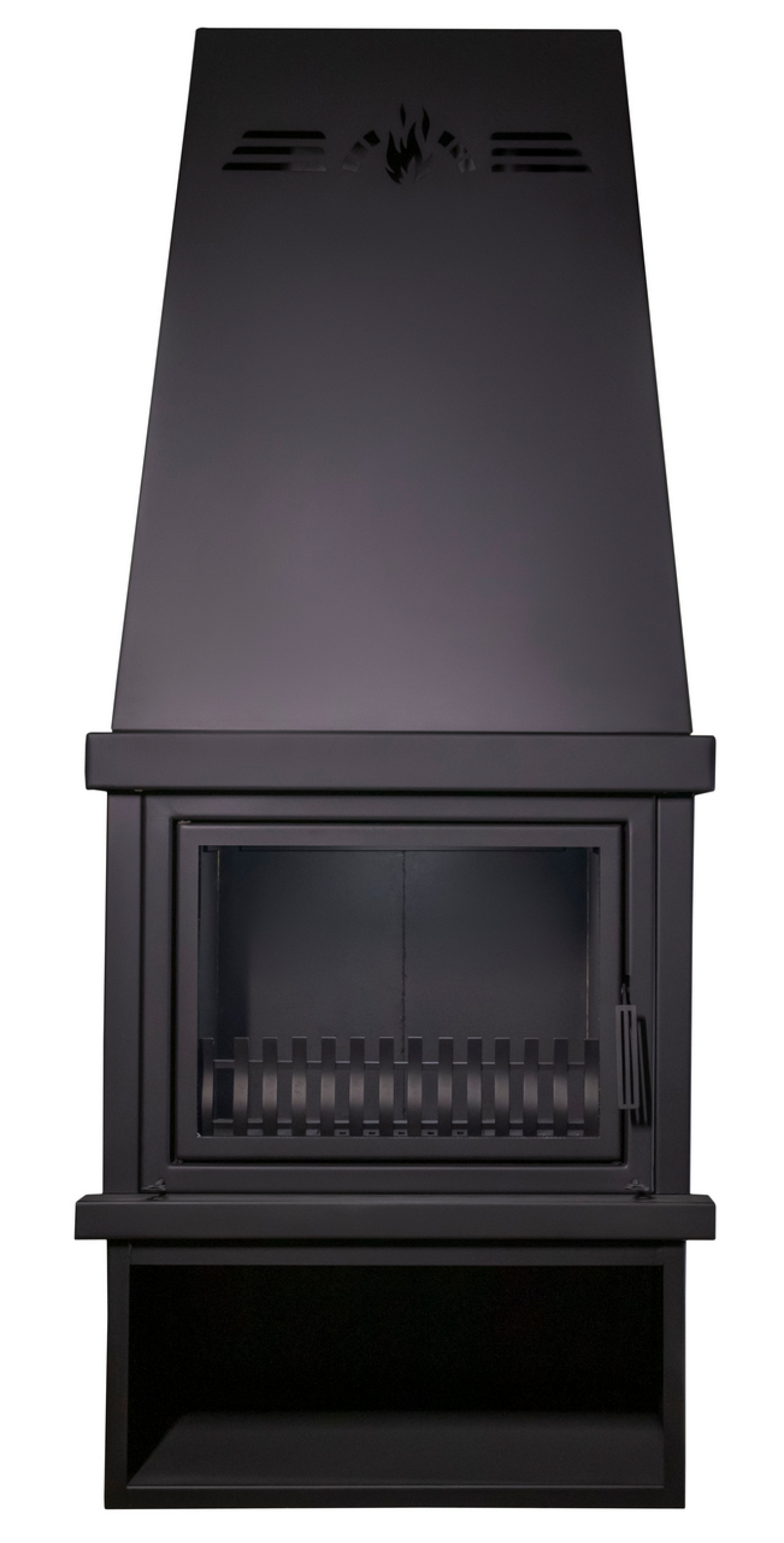Легкий камин-моноблок, быстрый легкий монтаж и подсоединение к дымоходу. Быстрый конвекционный нагрев помещения площадью 50-100 м2 в зимнее время за 2-3 часа. Большая топочная дверка со стеклом. Идеально подходит для среднего дачного дома как основной источник тепла осенью и весной. Размер поленьев до 50 см. Подключение к дымоходу сверху. Время горения 3-5 часов