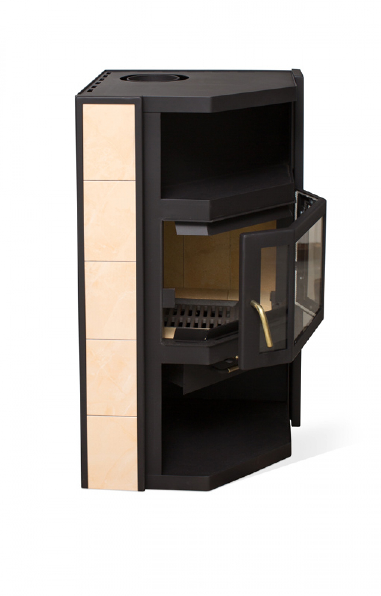 Классическая угловая печь с панорамным обзором. Идеально подходит для обогрева помещения площадью 45-90 м2. Призматическая дверка из трех стекол высотой 330 мм. В отделке боковых поверхностей используется керамическая плитка. Размер поленьев 30 – 60 см. Подсоединение к дымоходу сверху.
